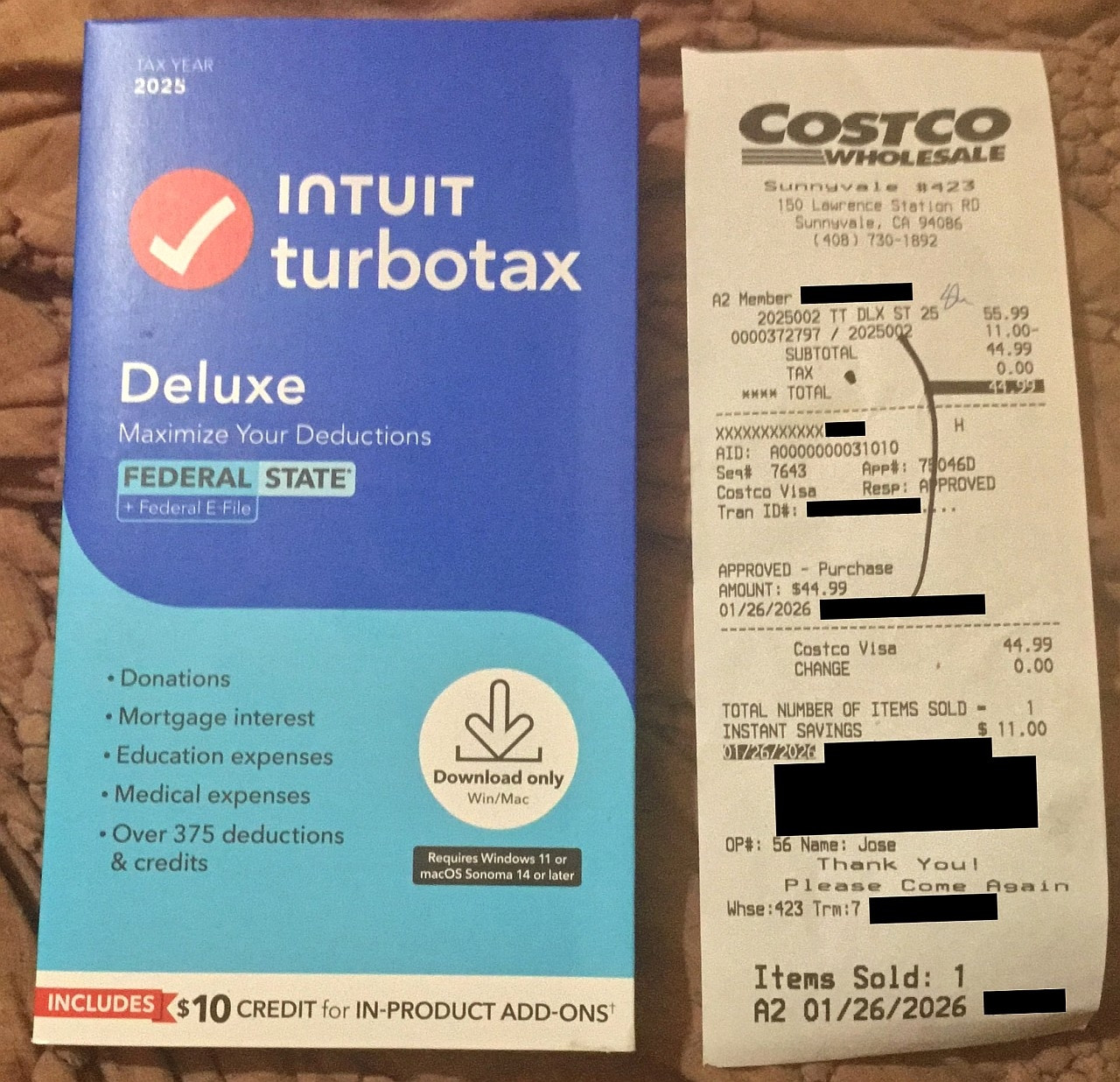 I bought TurboTax at Costco today for $55.99 - $11 = $44.99 + 0% tax.